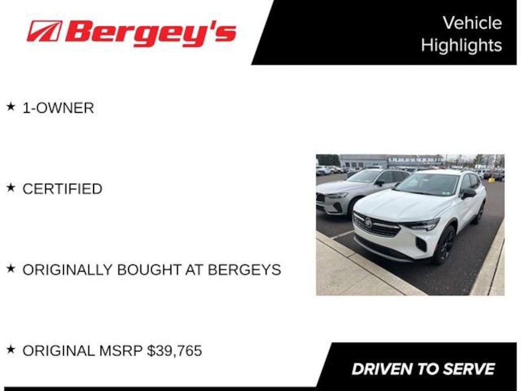 Certified Vehicle!This 2023 Buick Envision Preferred is a standout choice for the discerning driver. With its impressive list of premium features, this certified pre-owned SUV is a true gem on the market.- 1-OWNER- CERTIFIED- ORIGINAL MSRP $39,765- ORIGINALLY BOUGHT AT BERGEYS- SPORT TOURING PACKAGEThis Envision Preferred comes equipped with the sought-after Sport Touring Package, elevating its style and performance. Enjoy the bold 20-inch wheels, unique ST badging, and sleek dark finishes that give this SUV a commanding presence on the road.Under the hood, the 2.0L turbocharged engine and 9-speed automatic transmission deliver a responsive and efficient driving experience, with an impressive 22 city / 29 highway MPG. The advanced all-wheel-drive system ensures confident handling in all conditions.Stepping inside, you'll be greeted by a well-appointed interior that combines style and comfort. Indulge in the premium audio system, dual-zone automatic climate control, and power driver's seat for a truly luxurious driving experience. The Buick Infotainment System with wireless Apple CarPlay and Android Auto integration keeps you connected and entertained on the go.Certified Vehicle! This Envision has been meticulously inspected and reconditioned to meet Buick's rigorous standards, giving you the peace of mind of a like-new vehicle with the added benefit of a comprehensive warranty. With its impressive features, efficient performance, and certified status, this 2023 Buick Envision Preferred is an exceptional value in the pre-owned market.Don't miss your opportunity to experience the refinement and capability of this exceptional SUV. Schedule a test drive today and discover why the Envision Preferred should be your next automotive choice.