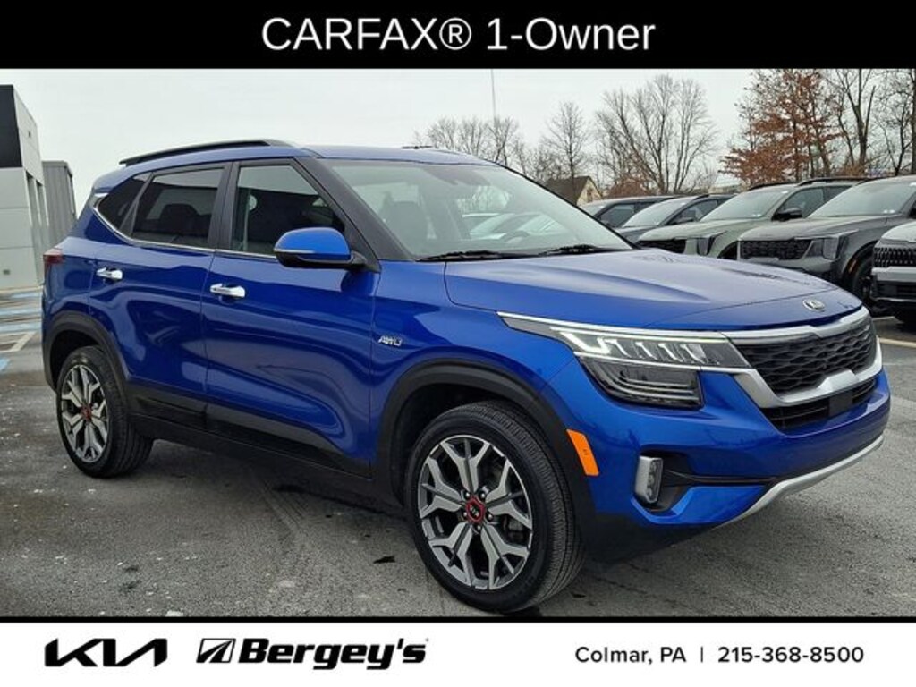 Certified. Neptune Blue 2021 Kia Seltos SX AWD 7-Speed Automatic I4 1-OWNER, CERTIFIED, FRESH OIL CHANGE, NEW FRONT BRAKES, NEW PA INSPECTION, PROFESSIONAL DETAIL.