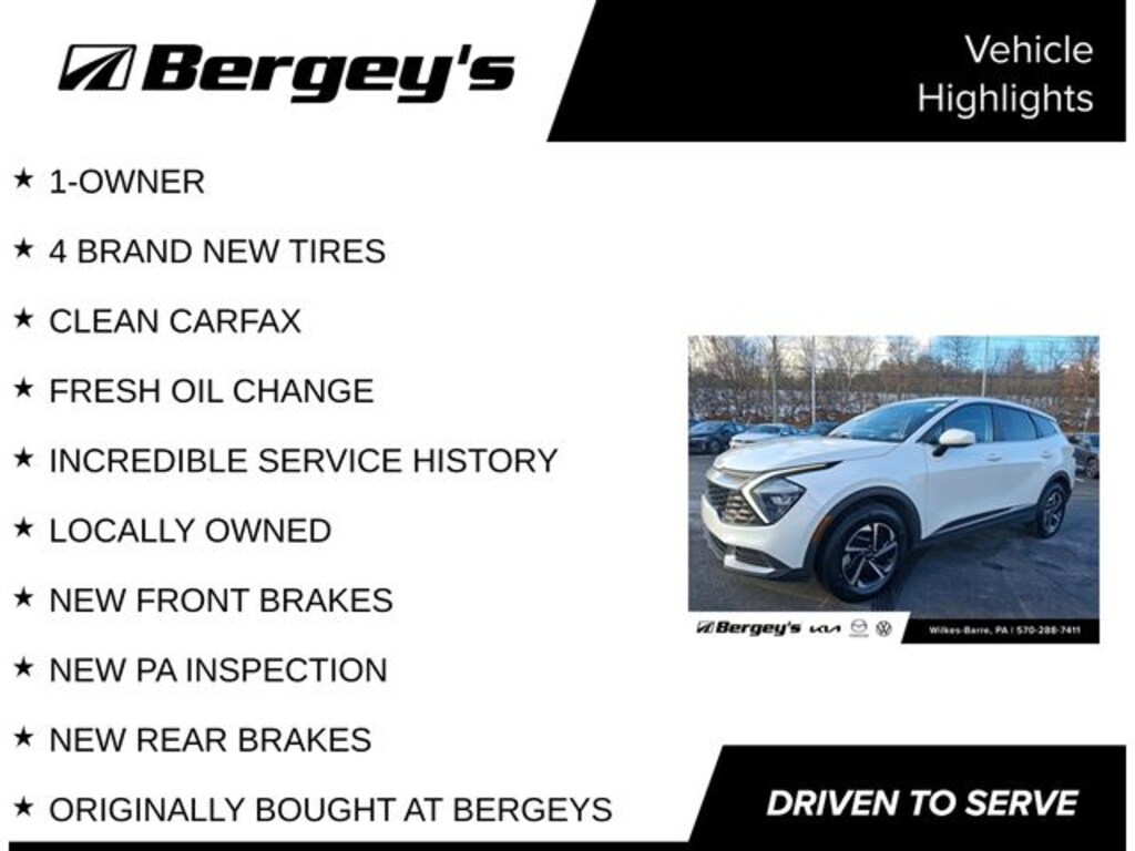 Certified. Snow White Pearl 2023 Kia Sportage Hybrid LX AWD 6-Speed Automatic 1.6L Turbo GDI 4-Cylinder 1-OWNER, 4 BRAND NEW TIRES, CLEAN CARFAX, FRESH OIL CHANGE, INCREDIBLE SERVICE HISTORY, LOCALLY OWNED, NEW FRONT BRAKES, NEW PA INSPECTION, NEW REAR BRAKES, ORIGINALLY BOUGHT AT BERGEYS, PROFESSIONAL DETAIL, SERVICED AT BERGEYS ITS WHOLE LIFE, 1.6L Turbo GDI 4-Cylinder.