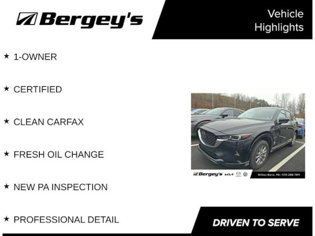 Certified. Jet Black Mica 2024 Mazda CX-5 2.5 S Preferred Package AWD 6-Speed Automatic 2.5L I4 DOHC 16V LEV3 SULEV30 187hp 1-OWNER, CERTIFIED, CLEAN CARFAX, FRESH OIL CHANGE, NEW PA INSPECTION, PROFESSIONAL DETAIL.