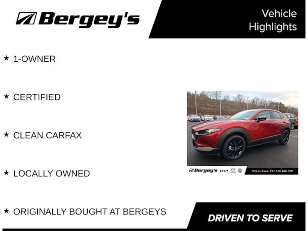 Certified. Soul Red Crystal Metallic 2025 Mazda CX-30 2.5 Turbo Premium Package AWD 6-Speed Automatic 2.5L I4 1-OWNER, CERTIFIED, CLEAN CARFAX, LOCALLY OWNED, ORIGINALLY BOUGHT AT BERGEYS.