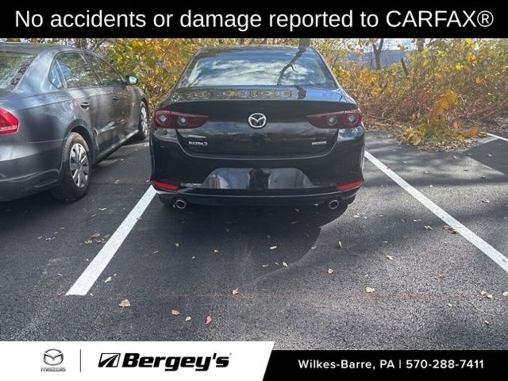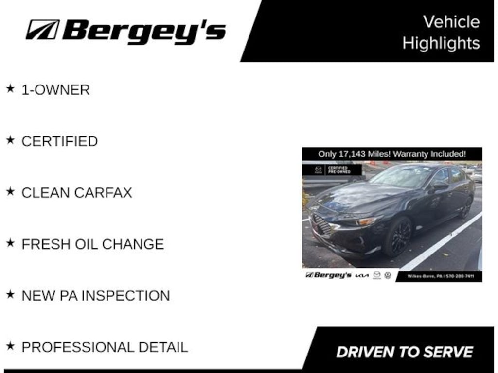 Certified. Jet Black Mica 2025 Mazda Mazda3 2.5 S Select Sport FWD 6-Speed Automatic 2.5L I4 DOHC 16V LEV3-SULEV30 191hp Mazda Certified Pre-Owned Certified, 4-Wheel Disc Brakes, 6 Speakers, ABS brakes, Air Conditioning, Alloy wheels, AM/FM radio, AppLink/Apple CarPlay and Android Auto, Auto High-beam Headlights, Automatic temperature control, Brake assist, Bumpers: body-color, Compass, Delay-off headlights, Driver door bin, Driver vanity mirror, Dual front impact airbags, Dual front side impact airbags, Electronic Stability Control, Emergency communication system: Mazda Connected Services (1-year complimentary trial included), Exterior Parking Camera Rear, Front anti-roll bar, Front Bucket Seats, Front Center Armrest, Front dual zone A/C, Front reading lights, Front Sport Bucket Seats, Front wheel independent suspension, Fully automatic headlights, Heated door mirrors, Illuminated entry, Knee airbag, Leather Shift Knob, Leather steering wheel, Leatherette Seat Trim, Low tire pressure warning, MAZDA CONNECT Infotainment System, Occupant sensing airbag, Outside temperature display, Overhead airbag, Overhead console, Panic alarm, Passenger door bin, Passenger vanity mirror, Power door mirrors, Power steering, Power windows, Radio data system, Radio: AM/FM Audio System, Rain sensing wipers, Rear seat center armrest, Rear side impact airbag, Rear window defroster, Remote keyless entry, Speed control, Speed-sensing steering, Split folding rear seat, Steering wheel mounted audio controls, Tachometer, Telescoping steering wheel, Tilt steering wheel, Traction control, Trip computer, Turn signal indicator mirrors, Variably intermittent wipers, Wheels: 18" x 7J Aluminum Alloy, 1-OWNER, CERTIFIED, CLEAN CARFAX, FRESH OIL CHANGE, NEW PA INSPECTION, PROFESSIONAL DETAIL.