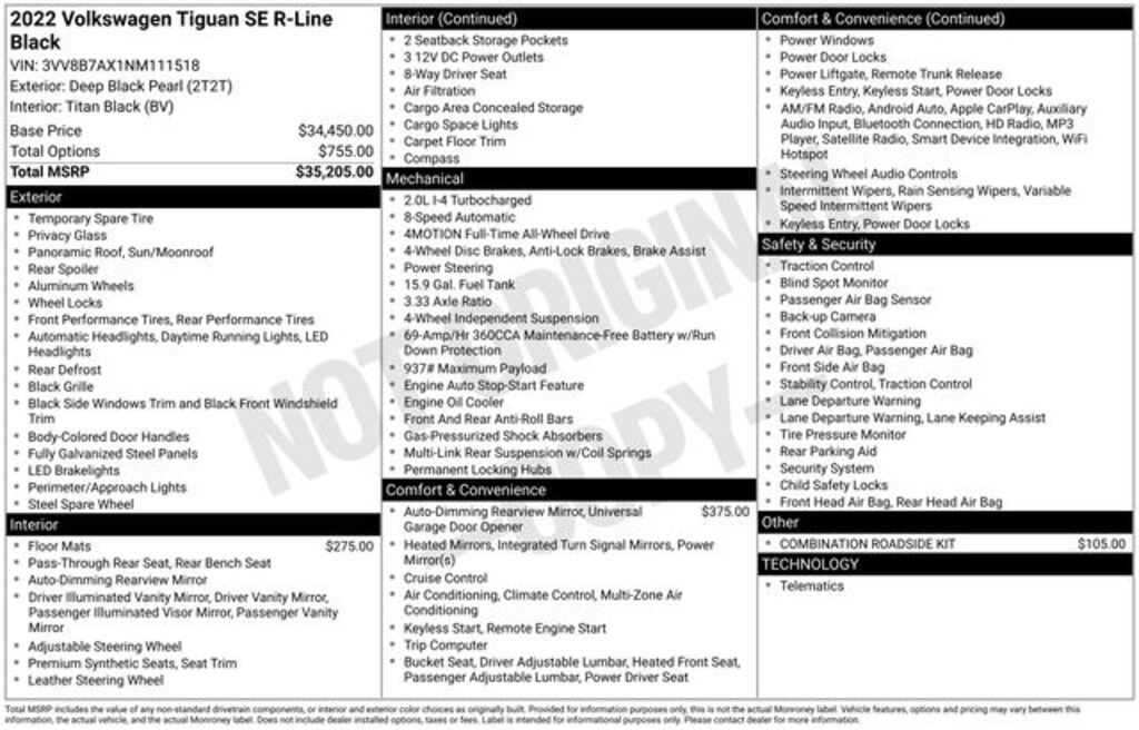 Deep Black 2022 Volkswagen Tiguan 2.0T SE R-Line Black AWD 8-Speed Automatic with Tiptronic 2.0L TSI DOHC AWD.