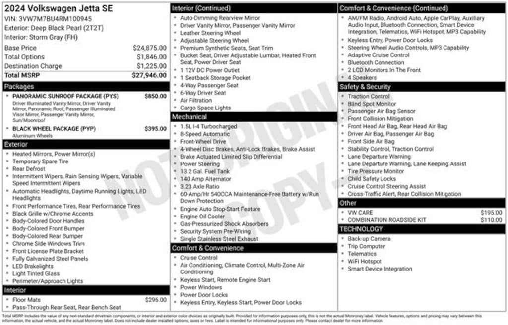 Certified. Deep Black 2024 Volkswagen Jetta 1.5T SE FWD 8-Speed Automatic with Tiptronic 1.5L I-4 DI DOHC Turbocharged Storm Gray Premium Synthetic.
