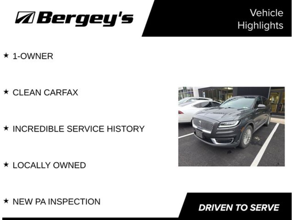 Magnetic Gray 2019 Lincoln Nautilus Standard AWD 8-Speed Automatic 2.0L Turbocharged 11 Speakers, 18" Premium Painted Aluminum Wheels, 3.80 Axle Ratio, 4-Wheel Disc Brakes, ABS brakes, Air Conditioning, Alloy wheels, AM/FM radio: SiriusXM, AppLink/Apple CarPlay and Android Auto, Auto High-beam Headlights, Auto-dimming Rear-View mirror, Automatic temperature control, Brake assist, Bumpers: body-color, CD player, Compass, Delay-off headlights, Driver door bin, Driver vanity mirror, Dual front impact airbags, Dual front side impact airbags, Electronic Stability Control, Emergency communication system: 911 Assist, Equipment Group 100A, Exterior Parking Camera Rear, Four wheel independent suspension, Front anti-roll bar, Front Bucket Seats, Front Center Armrest w/Storage, Front dual zone A/C, Front reading lights, Fully automatic headlights, Heated door mirrors, Heated front seats, Heated Lincoln Soft-Touch Front Bucket Seats, Illuminated entry, Knee airbag, Low tire pressure warning, Memory seat, Occupant sensing airbag, Outside temperature display, Overhead airbag, Overhead console, Panic alarm, Passenger door bin, Passenger vanity mirror, Power door mirrors, Power driver seat, Power Liftgate, Power passenger seat, Power steering, Power windows, Radio data system, Radio: Single-CD w/SiriusXM Radio, Rear anti-roll bar, Rear reading lights, Rear seat center armrest, Rear window defroster, Rear window wiper, Remote keyless entry, Security system, Speed control, Speed-sensing steering, Speed-Sensitive Wipers, Split folding rear seat, Spoiler, Steering wheel mounted A/C controls, Steering wheel mounted audio controls, SYNC 3 Communications & Entertainment System, Tachometer, Telescoping steering wheel, Tilt steering wheel, Traction control, Trip computer, Turn signal indicator mirrors, Variably intermittent wipers, 1-OWNER, CLEAN CARFAX, INCREDIBLE SERVICE HISTORY, LOCALLY OWNED, NEW PA INSPECTION.