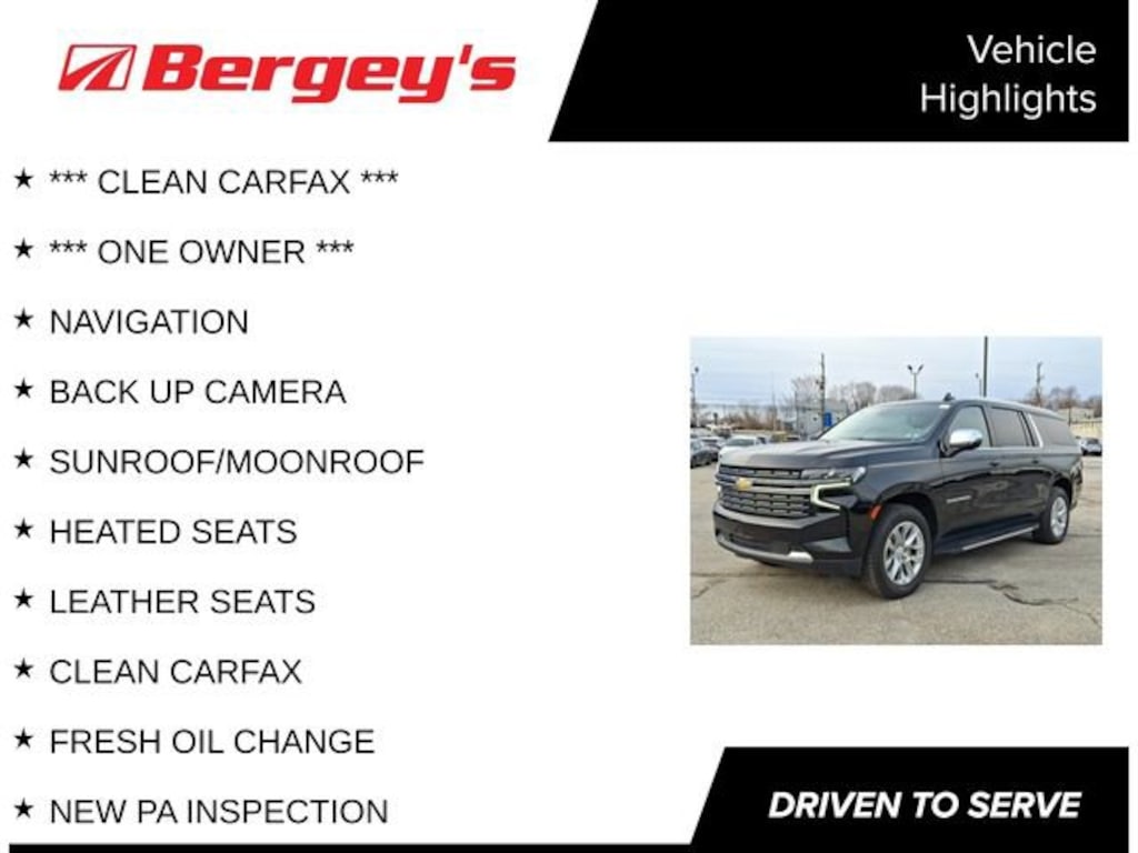 *** CLEAN CARFAX ***, *** ONE OWNER ***, NAVIGATION, BACK UP CAMERA, SUNROOF/MOONROOF, HEATED SEATS, LEATHER SEATS, CLEAN CARFAX, FRESH OIL CHANGE, NEW PA INSPECTION, 12-Way Power Driver & Passenger Seat Adjusters, 1st & 2nd Row Color-Keyed Carpeted Floor Mats, 2-Speed Active Electronic AutoTrac Transfer Case, 3rd Row 60/40 Power-Folding Split-Bench, Auto-Dimming Inside Rear-View Mirror, Bose 10-Speaker Surround w/CenterPoint, Bright Front & Rear Door Sill Plates, Chrome Door Handles w/Body-Color Strip, Chrome Mirror Caps, Color-Keyed Carpeting Floor Covering, Driver & Front Outboard Passenger Airbags, Dual Exhaust System, Enhanced Driver Information Center, Floor Console, Hands-Free Rear Power Programmable Liftgate, Heated 2nd Row Outboard Seats, Heated Driver & Front Passenger Seats, Heated Steering Wheel, Hill Descent Control, Infotainment Display, Lane Change Alert w/Side Blind Zone Alert, LED Daytime Running Lamps, Memory Settings, Navigation System, Outside Heated Power-Adjustable Mirrors, Perforated Heated & Ventilated Seats, Power Release 2nd Row Bucket Seats, Power Tilt & Telescopic Steering Column, Preferred Equipment Group 1LZ, Rear Cross Traffic Alert, Remote Start, Safety Alert Seat, SiriusXM w/360L, Universal Home Remote, Wireless Charging, Wrapped Steering Wheel. Certified. Certification Program Details: *6-Month/6,000-Mile Bumper-to-Bumper Limited Warranty*, whichever comes first, in addition to any remaining original factory Bumper-to-Bumper warranty. See participating dealer and warranty booklet for limited warranty eligibility and coverage details, including limitations and exclusions. *Except for non-GM vehicles in the State of California, where coverage will be provided by a vehicle service contract.2024 Black Chevrolet Suburban 4WD EcoTec3 5.3L V8 10-Speed Automatic with Overdrive